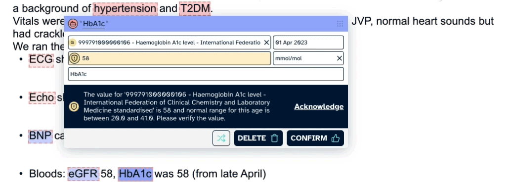 In addition to AI coding suggestions, we have built a large number of checks and balances into BetterLetter. These draw a coder's attention to key information in both the letter and the patient’s care history. This includes reference ranges for pathology results, safeguarding information on the patient record, and unusual diagnoses or variations from coding protocol (e.g. “Are you sure you trust that DVT diagnosis from A&E with no associated ultrasound?”). This goes a step further than coding a letter in isolation, and encourages the reviewer to consider the patient’s wider medical history and personal context. Ultimately it is about providing the reviewer with the best data available for them to make a decision about which codes and actions are most appropriate.